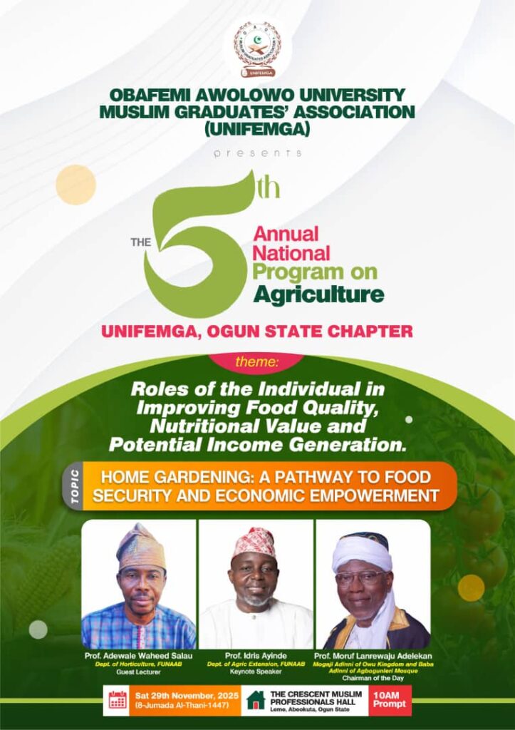 The Obafemi Awolowo University Muslim Graduates Association (UNIFEMGA), Ogun State chapter, has announced plans to hold its 5th Annual National Agriculture Programme, with a strong focus on boosting food security, improving nutrition, and creating income-generating opportunities for Nigerians.