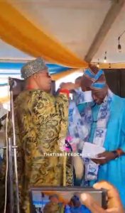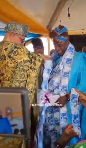 In a shocking turn of events, Oba Kolawole Sowemimo, the Olu of Owode-Egba in Ogun State, is under intense scrutiny after a video surfaced showing him openly abusing the country’s currency during his wife’s 60th birthday celebration.