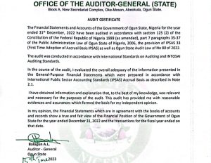 in a recent statement titled “Audit Certificate,” Balogun A.L., the Auditor-General of Ogun State, announced the completion of the audit for the Financial Statements and Accounts of the state government for the year ended December 31, 2022.