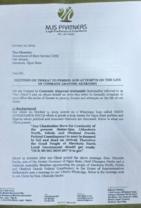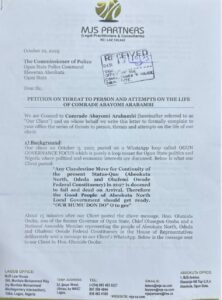 In a petition dated October 10, 2025, addressed to the Director of the Department of State Services (DSS), Oke-Mosan, Abeokuta, and Commissioner of police, Eleweran, Abeokuta, Arabambi’s legal team, MJS Partners, led by Prof. Yemi Oke, SAN, alleged that Hon. Osoba sent menacing messages to their client following a political comment he made in a WhatsApp group known as Ogun Governance Focus.