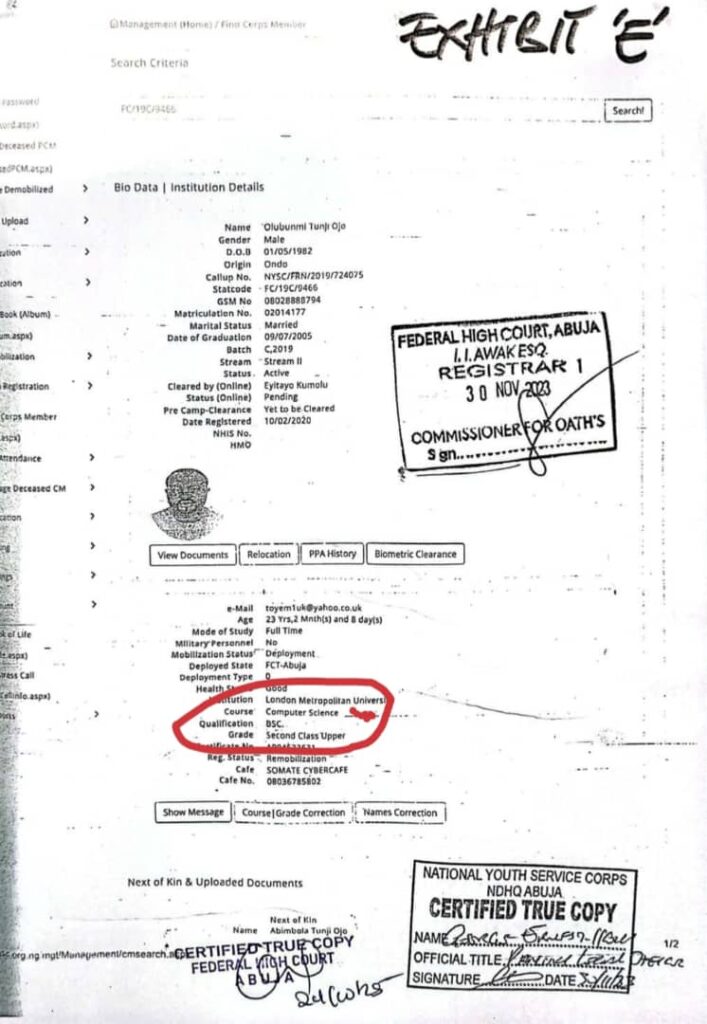 According to the leaked court documents, the NYSC Director-General, while testifying under oath, stated that Tunji-Ojo was mobilised for national service on the basis of a Bachelor of Science (BSc) degree in Computer Science from London Metropolitan University.
