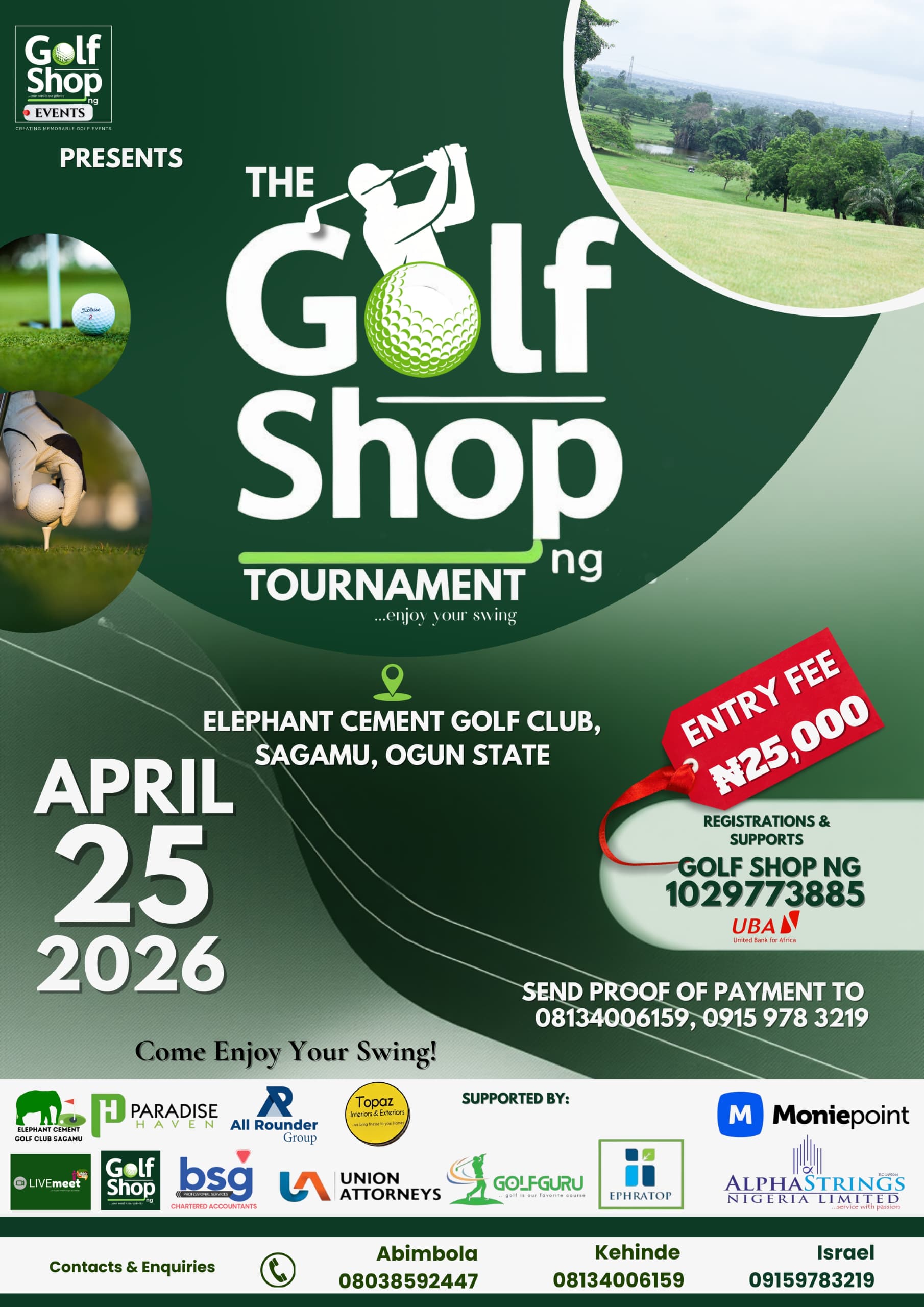 Interested golfers are required to pay a registration fee of N25,000 to the account: 1029773885, Golf Shop NG, UBA, and send proof of payment to any of the following contacts: Kehinde: 08134006159; Abimbola: 08038592447; Isreal: 09159783219.