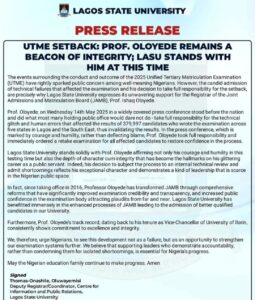 “Rather than deflect blame or issue evasive statements, Prof. Oloyede’s decision to accept full responsibility and initiate an immediate solution reflects a rare kind of leadership in Nigeria’s public space,” said the Deputy Registrar and Coordinator of LASU’s Centre for Information and Public Relations, Oluwayemisi Thomas-Onashile.